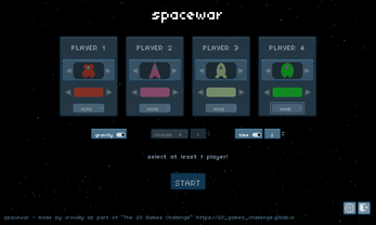 Back to Spacewar, once I got the basics down, I decided to extend it a bit more and experiment with some things I wanted to play with, such as having local multiplayer with more than two players, allowing customization of these players, along with a simple UI to facilitate it.